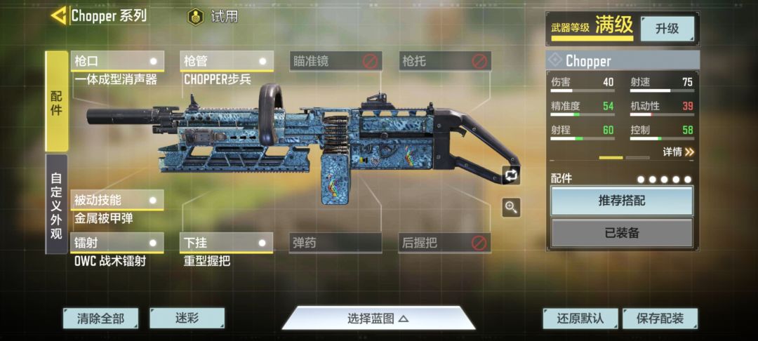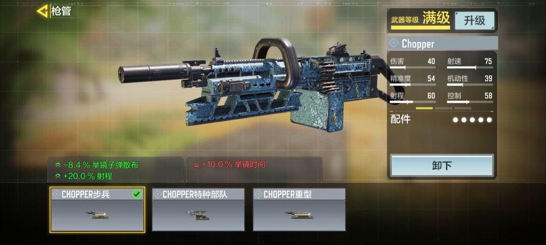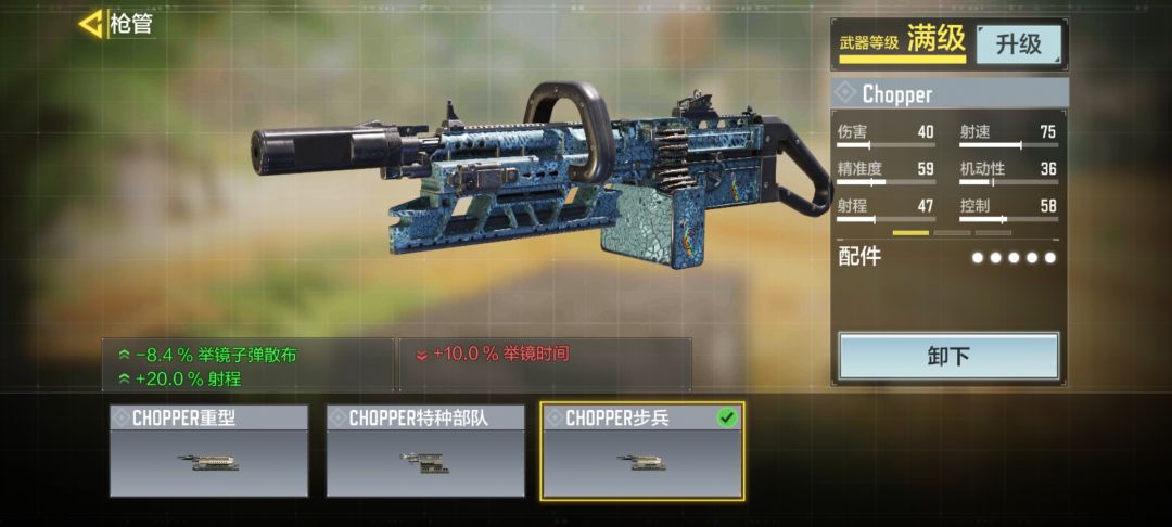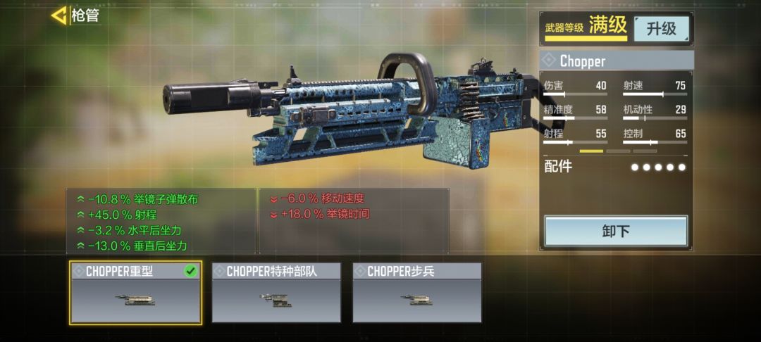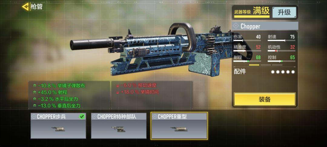 核心配件:“Chopper步兵”有人会问,不是叠开镜速度吗?为什么不用减开镜速度的“Chopper特种部队”反而用增加开镜时间的“步兵”?这点我也经过了考虑,机枪重要的是压制和牵扯,就算是打进攻流也要注重自己的压制能力,而Chopper在远距离的伤害衰减的是很大的,所以为了适应战局,我们要选择加射程的“步兵”,同时也减少了开镜后的子弹散布,让我们能更加得心应手的掌控这把枪