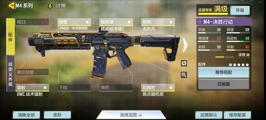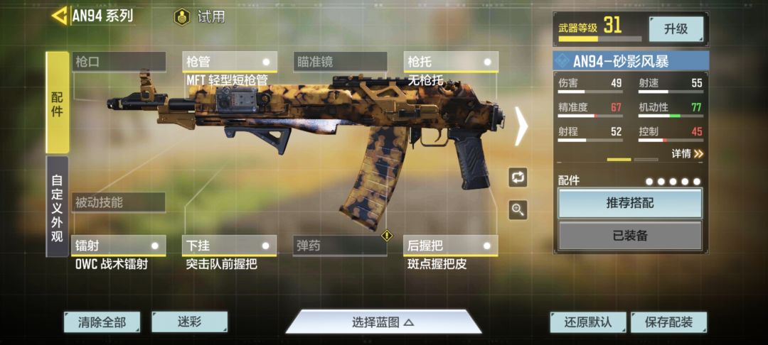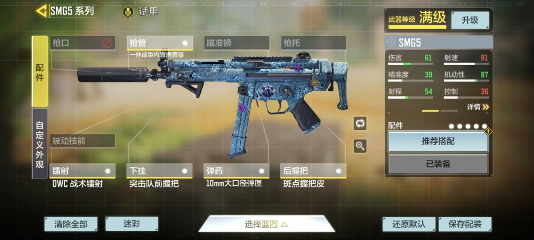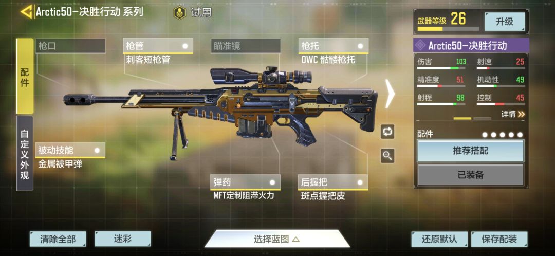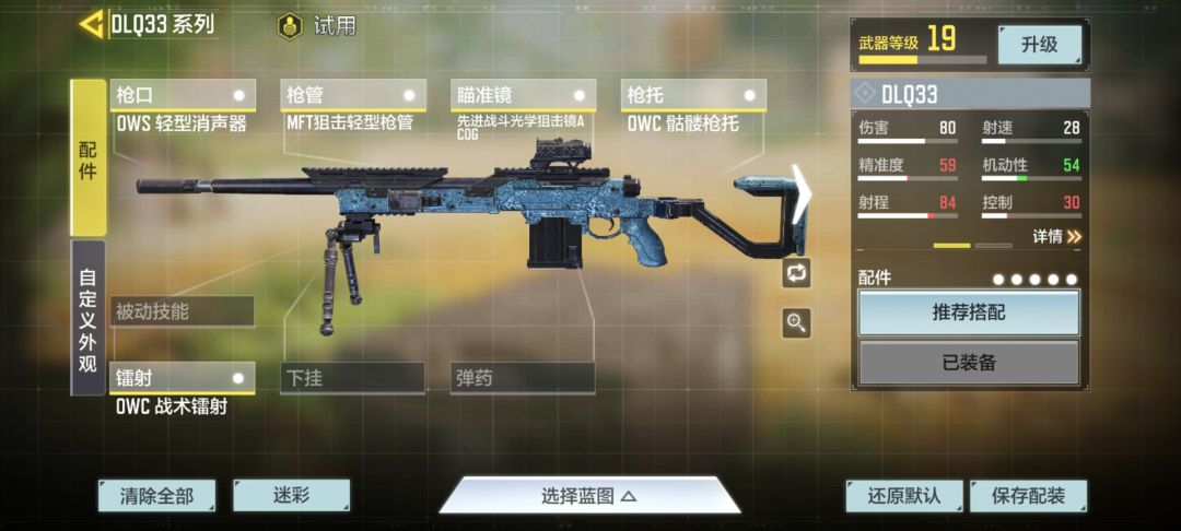 ②.冲锋狙:可以直接套用系统推荐的冲锋狙配装。OWS轻型消音器、MFT狙击轻型枪管、先进战斗光学狙击镜ACOG、OWC骷髅枪托、OWC战术镭射