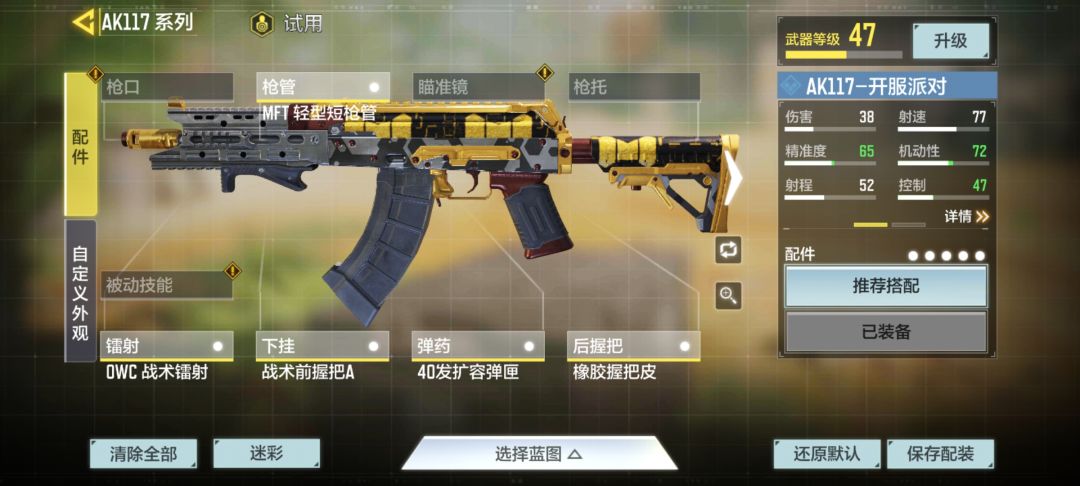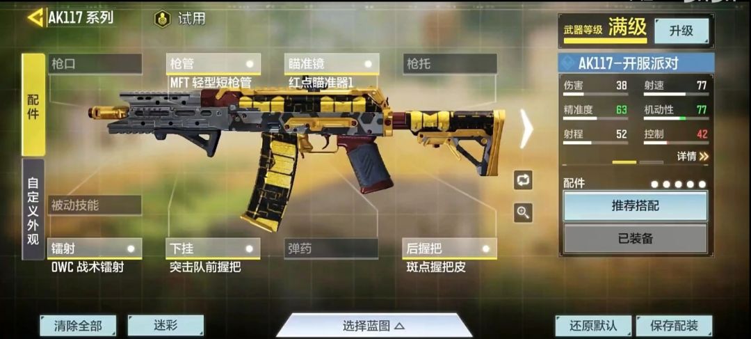 ②.个人最近在用的117配装,排位越到后面越喜欢AK117这把枪:MFT轻型短枪管、OWC战术镭射、战术前握把A、40发扩容弹匣、橡胶握把皮。