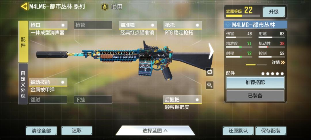 配装:一体成型消音器、经典红点瞄准镜(瞄准镜可以凭个人喜好更换,这个镜视野很大所以我用的这个)、RTG稳定枪托、金属被甲弹、颗粒握把皮