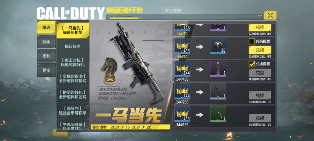 【获取途径】1.15—1.28期间击杀数达到200即可在活动“一马当先”里兑换T0武器“Chopper”,各位一定不要错过这把神级机枪!(活动如下图)
