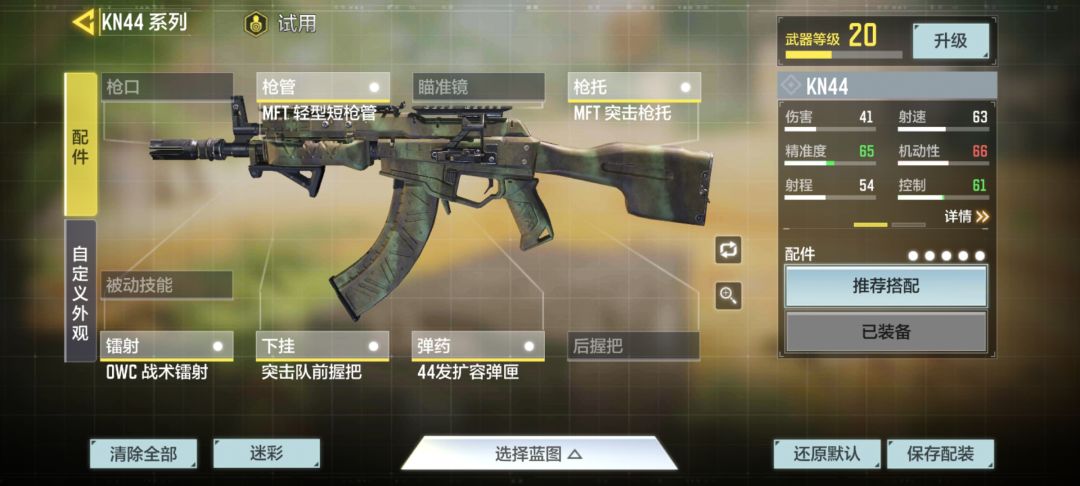 配装:MFT轻型短枪管、MFT突击枪托、OWC战术镭射、突击队前握把、44发扩容弹匣。