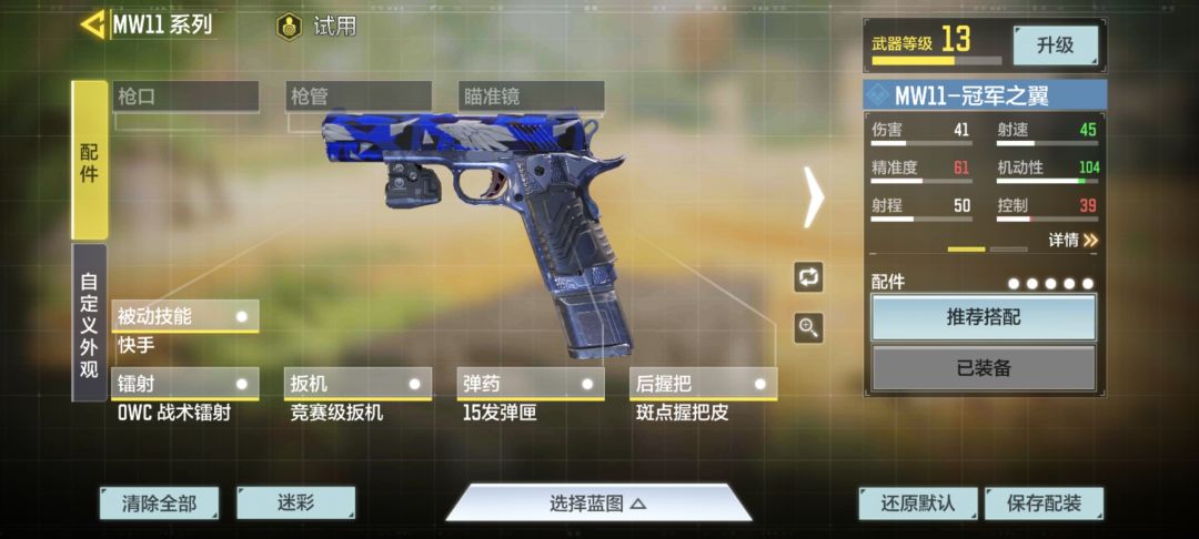 MW11手枪快速射击:快手,OWC战术镭射,竞赛级扳机,15发弹匣,斑点握把皮。