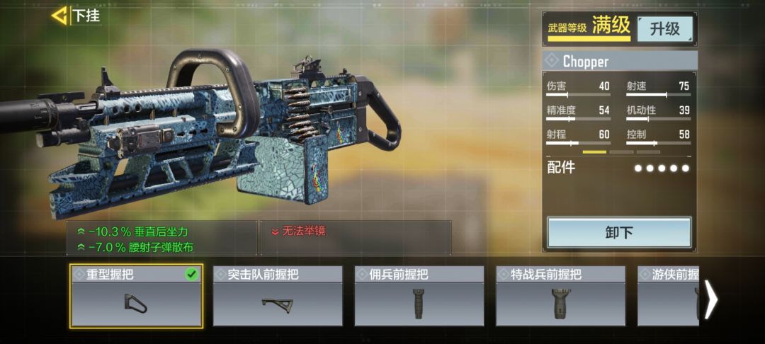 这把枪有着自己专属的下挂配件——重型握把,当你40级解锁这件配装并且装备后,这把枪才能被称作Chopper。重型握把装备后武器将无法开镜(开镜会转变为特殊缩放效果,击杀会被计入开镜击杀)
