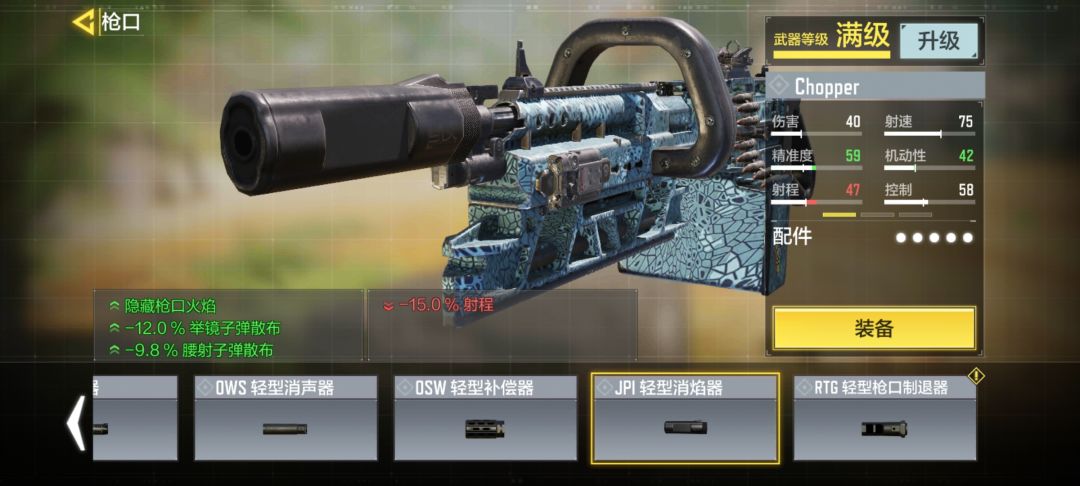配装:JPI轻型消焰器、Chopper重型(枪管)、金属被甲弹、JPI游侠镭射、重型握把