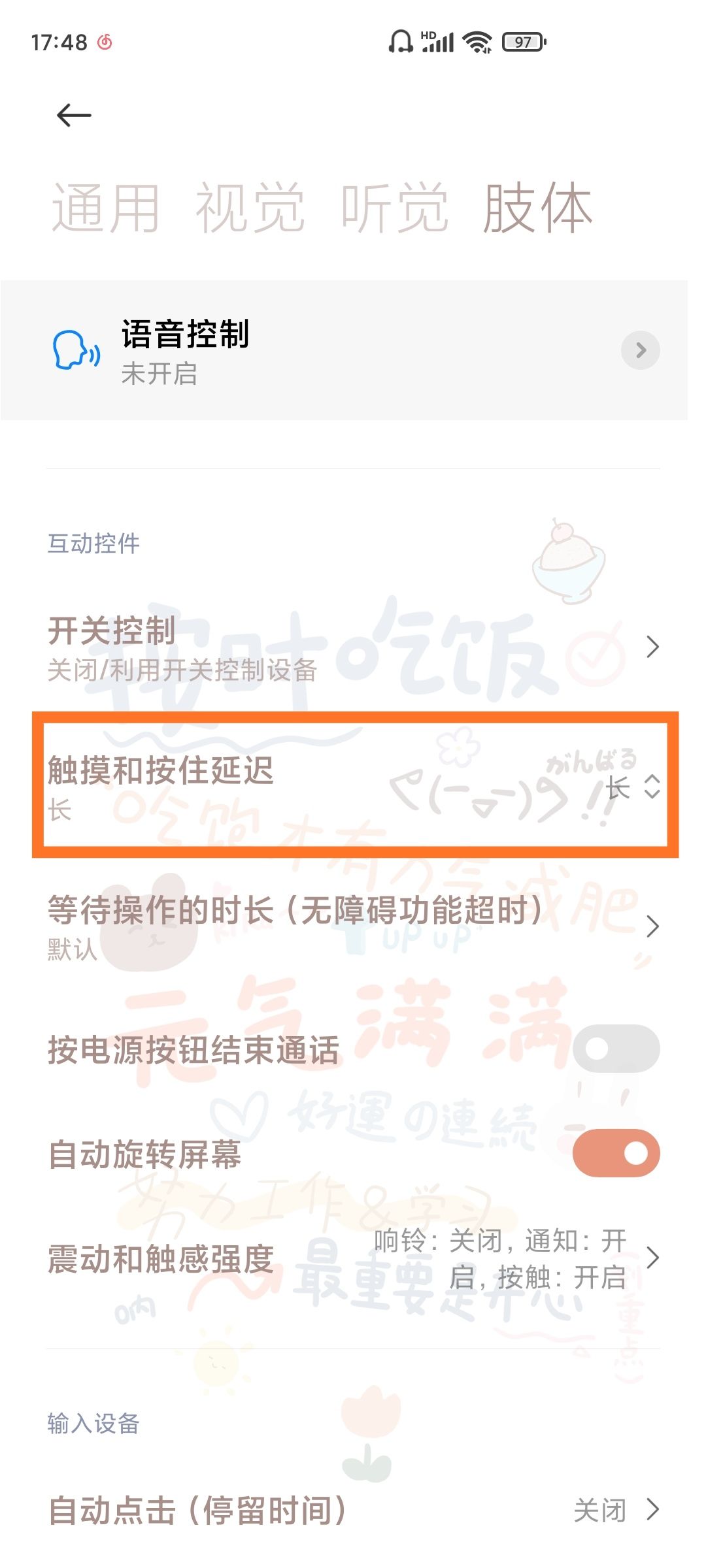 在手机设置中打开无障碍,将“触摸与按住延迟”从“短”改成“长”,本人机型是红米k30,但是这种方法在解决断触的同时,会对手机其他使用造成一定影响,比如在相册想要长按图片批量删除的时候,长按所需要的时间会更长,同理其他的长按操作都会需要更多的时间😖
