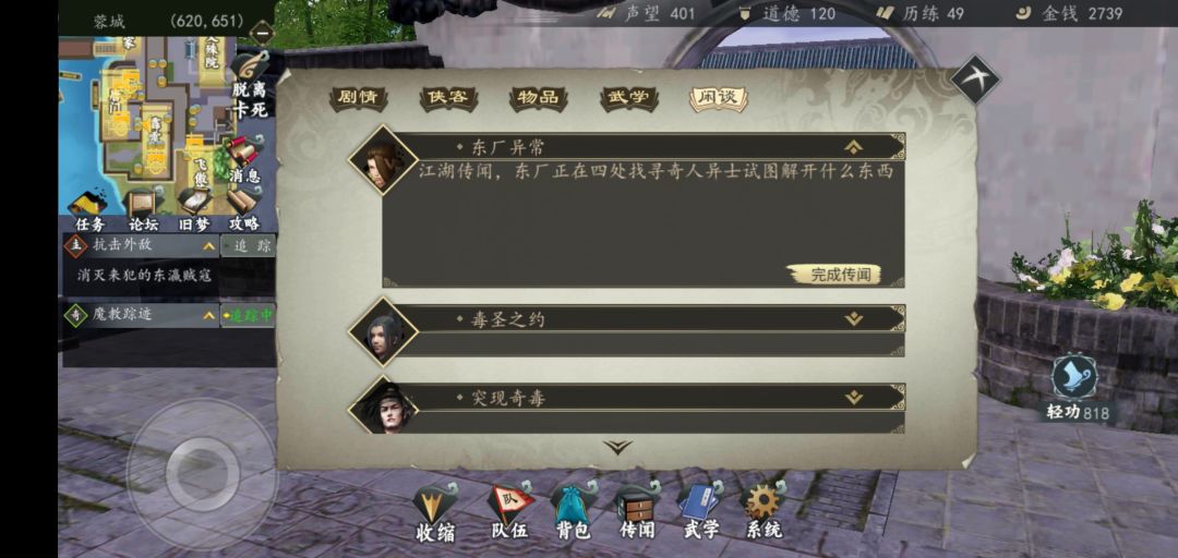 我走的新出的丐帮线,不知道其他线可不可以。在主线过桃花轩后刷出了这个传闻。
