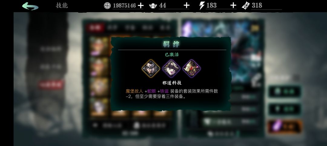 怪面科技(俗称魔堡羁绊):由魔堡故人+蛇眼+铁诞组成,其羁绊效果前期无用,后期必备,毕业必选,升华为邪道科技所需件数-2后与五圣祝福(衣)刻印搭配可以实现穿两件套装(除衣),有四件套装的效果;因魔堡故人心法强力的缘故,前期就可以开始培养。