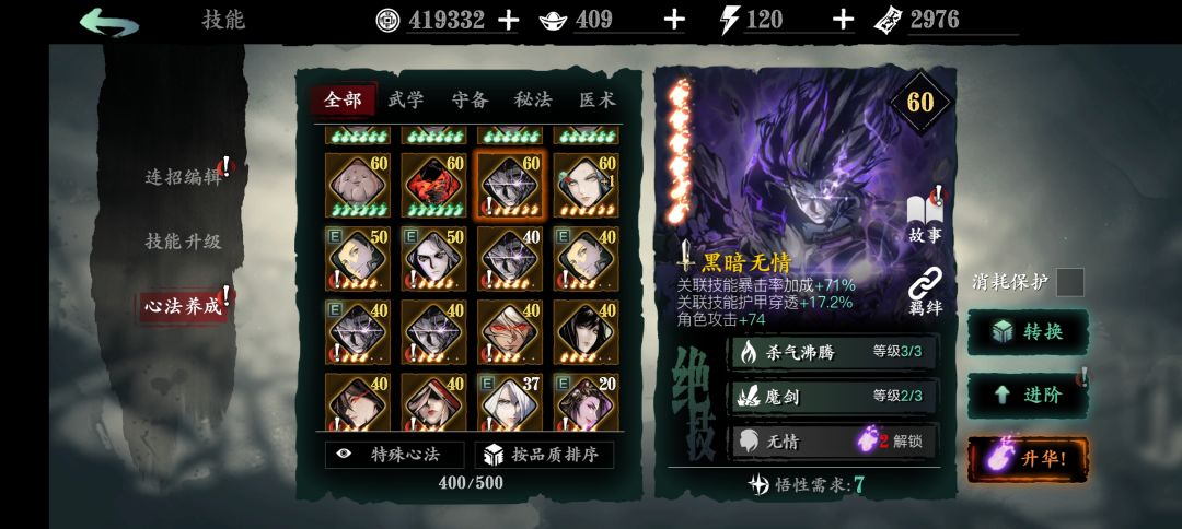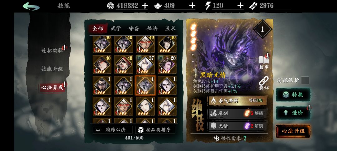 珍藏心法-心法分两种,普通心法和珍藏心法,珍藏心法的优势是基础面板比普通的略高一点,绝技上限也更高一点,所以养普通还是养珍藏玩起来都没多大差距,而且后面心法升华还要把同样的心法当狗粮吃,所以抽出合适的直接养就行。放两张对比图