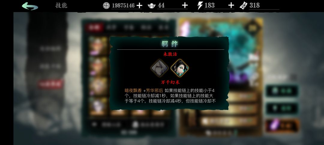 万千幻术(俗称暗芳羁绊):升华后技能链小于4个时冷却减2秒,大于等于4个时,冷却减6秒,后期伤害不能秒图时必备,用来缩减技能空档期,增加容错率;前期杀意不足时可携带暗夜飘香来获取杀意,后期走杀意流时也可携带。