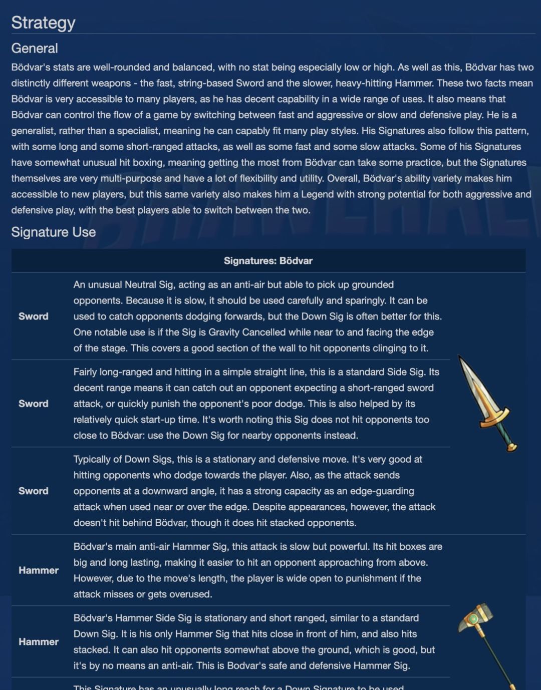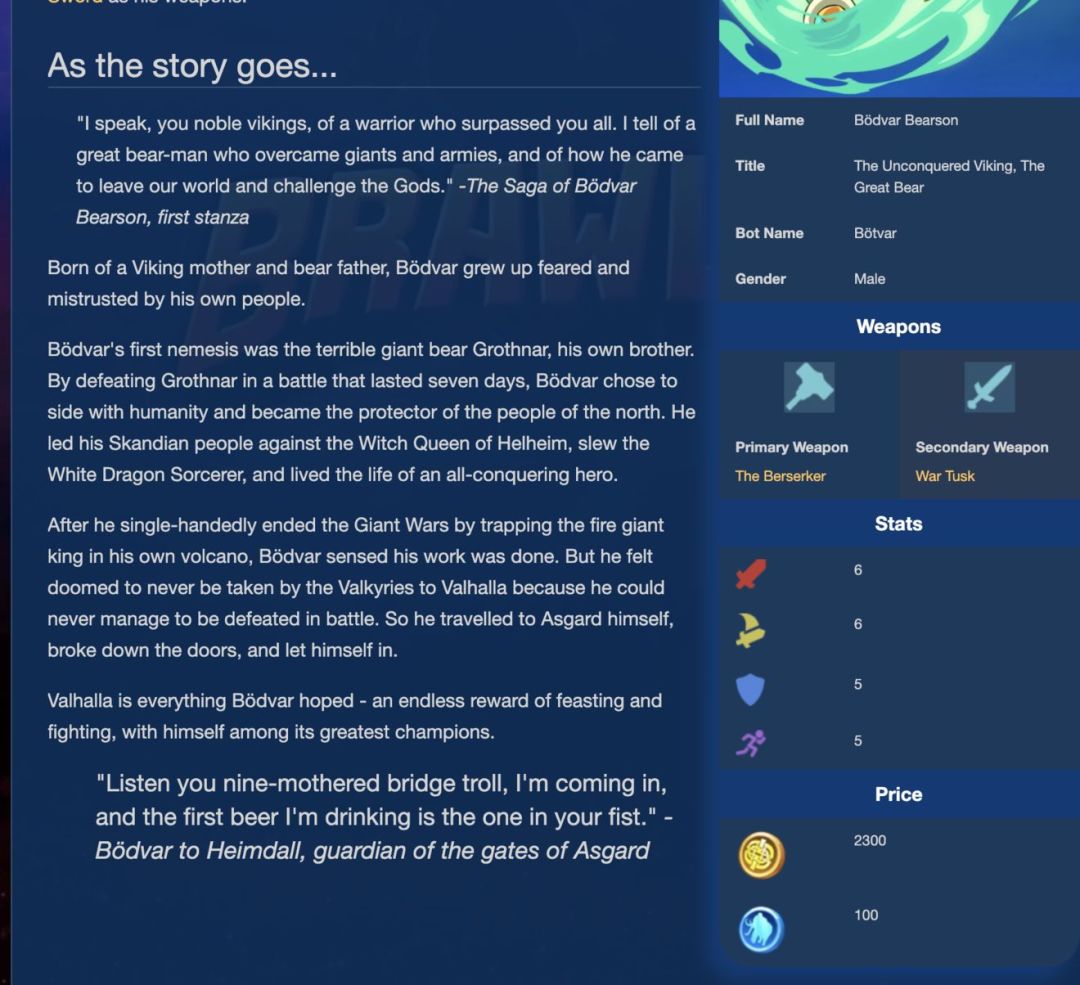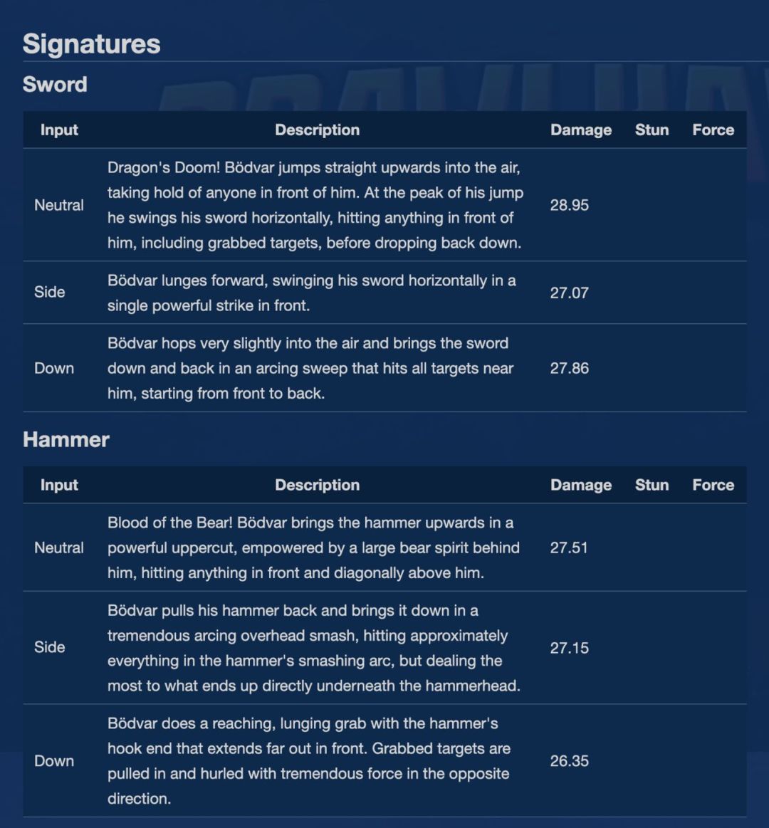 主要就是查看全角色的介绍、评测、出招表、策略等攻略内容了。以看板叔为例:https://brawlhalla.fandom.com/wiki/B%C3%B6dvar