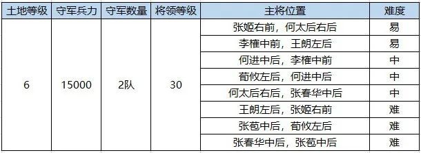 这里以6级地中难度最低的张姬队和难度最高的张春华队进行分析。首先可以看到张姬队的两队守军主将均在右侧,并且第一队主将是前排,所以即使不看技能配置,这块地的难度也是最低的。