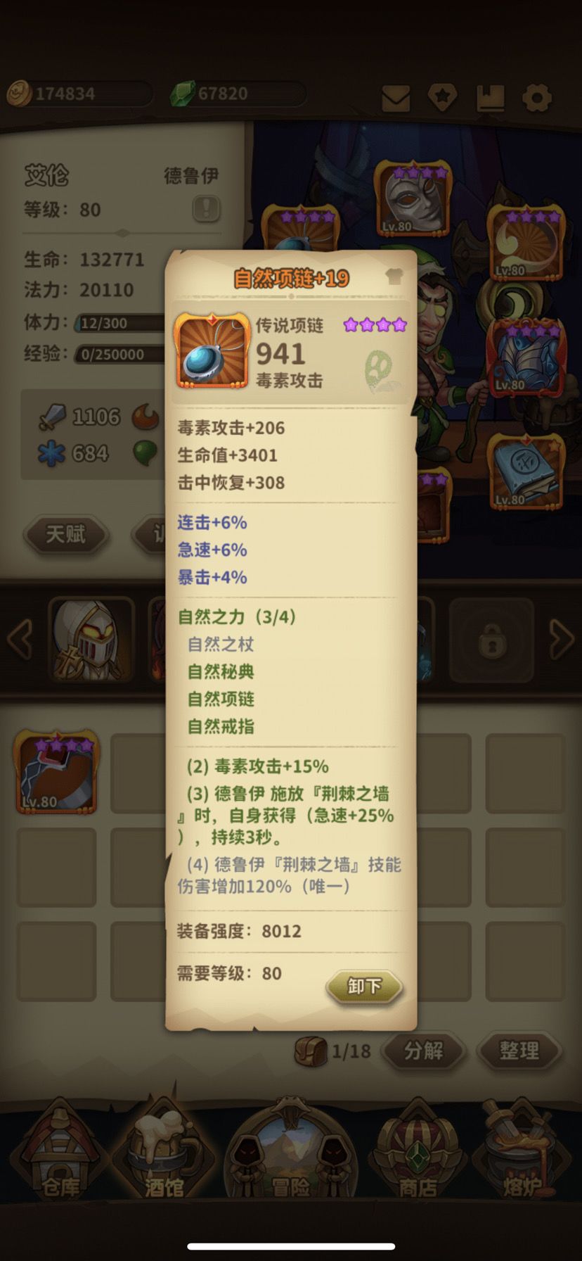 切记开出的任何法器一定要留好不要分解了,法器本来就很少点爆的几率还高。(强化装备可以通过垫装备来提升几率这里我就不详细讲了)接下来是自然套装的属性。没有好的连击武器你可以把全套的自然套装配上伤害一样可观。
