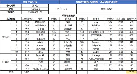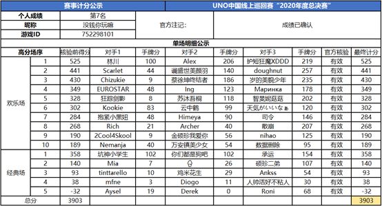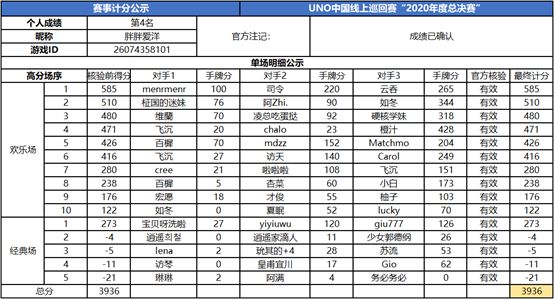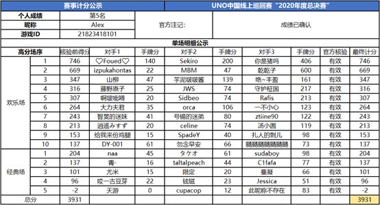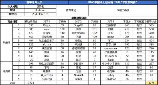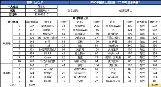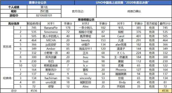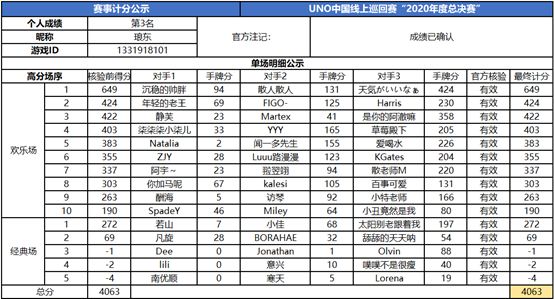 以上就是2020UNO中国线上巡回赛“年度总决赛”的战报内容,为了保证我们巡回赛的公正公平,根据规则,至少完成10场欢乐场及5场经典场的参赛玩家才会判定完成本站巡回赛,而利用多开或其他违规操作的选手我们将取消本次巡回赛成绩。