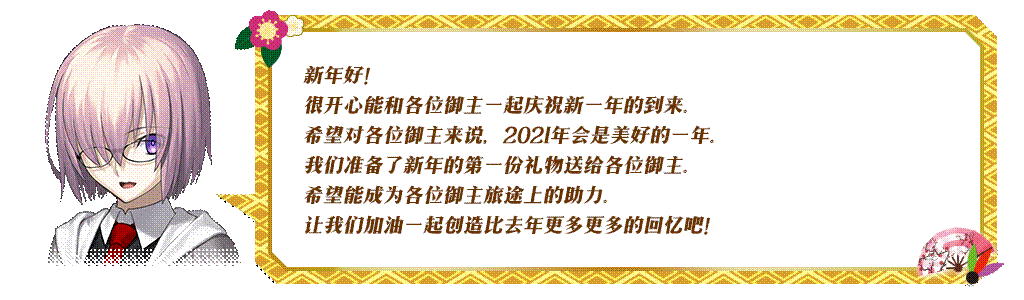 在以下时间段内,「御主任务」中的「限定」标签页内将限时追加「【2021年新年活动】任务」。