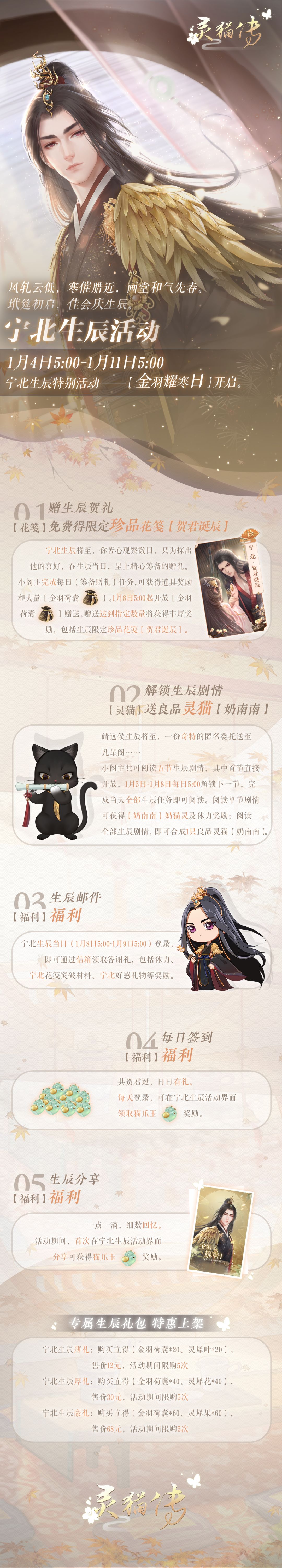 ✨共贺君诞,日日有礼。每天登录,可在宁北生辰活动界面领取猫爪玉奖励