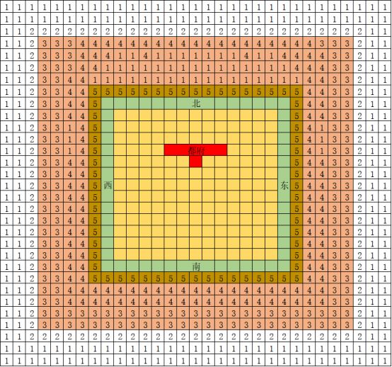 方法:城池黄色区域外,北门站8格,东西南可以站6格(策士5格、弓箭6格),铺满之后就可以大致确定有效输出位置,评估人员是否溢出。