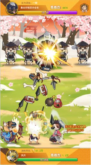 除了经营喵村以外,游戏中还加入了战斗系统,在pve方面,玩家可以派遣喵忍前去探寻推本,击败一直扰乱喵村的汪星人,除了能获得大量经验外,还能增加店铺的收入,获得喵村村名的报酬。而在pvp方面,游戏也为玩家准备了更加丰富的玩法,玩家可以直接组建一支小队在群喵争霸中挑战其他玩家,在奇袭中排兵布阵扫荡其他玩家,抢夺对方资源, 派遣喵忍小队占领海岛获得更多发展资源,在晋级赛中与其他玩家一较高下,也能够在挑战榜中横扫群雄获得万千玩家的瞩目。