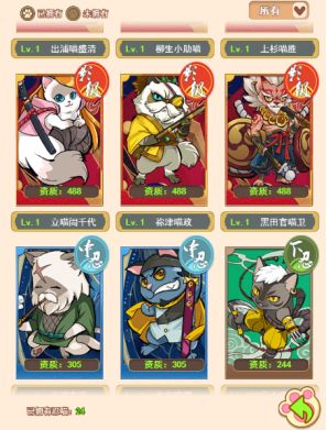 喵忍升级:游玩过程中有会加入很多品质不同的喵忍,喵忍经验是有限的,切记不要按照自己的喜好将所有经验用于升提升同一只喵忍等级,每一只喵忍都能提升喵忍招财速度,将资源平均投资在每一只喵忍上才能最大程度提升招财速度。