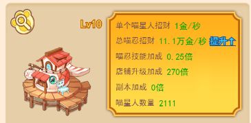 店铺招募:打工人,打工魂,打工都是人上人,要想让店铺赚更多的钱,就需要店铺雇佣更多的喵星人为你打工,雇佣的喵星人越多,店铺的赚钱速度就会越高,招募价格小于10倍自身招财速度,无脑招募就行啦,之后可以根据实际积喵币总量来招募。