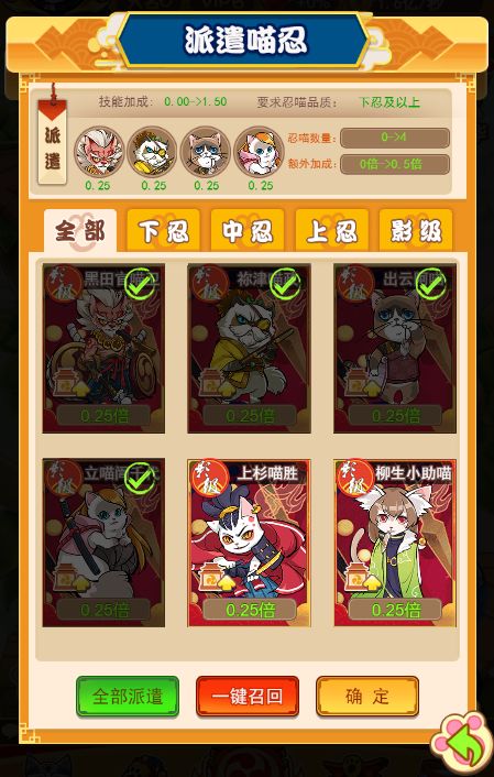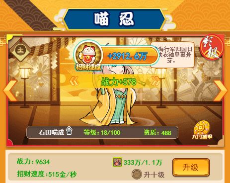 获得更多喵忍:除了提升喵忍等级外,最快的提升招财速度的方式当然是获得新喵忍,品质越高的喵忍所带来的招财速度提升越大。