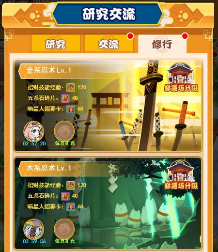 喵忍修行:每只喵忍的自身的招财速度会影响到所有的店铺赚钱速度,因此提升喵忍自身的招财速度将会大大提高总招财速度。而喵忍的招财技能将会以百分比的形式提升喵忍的招财速度,从而大幅提升总招财速度。喵忍招财技能的唯一产出途径就忍术修行,每隔3小时即可完成一次喵忍修行,建造师们定好闹钟勤快上线吧。