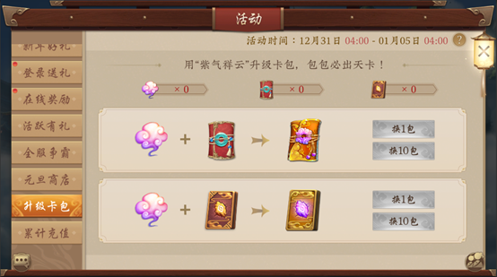 使用紫气祥云可将普通“开天包”或“补天包”升级成为“祥云开天包”或“祥云补天包”,必然能开出至少1张天卡!