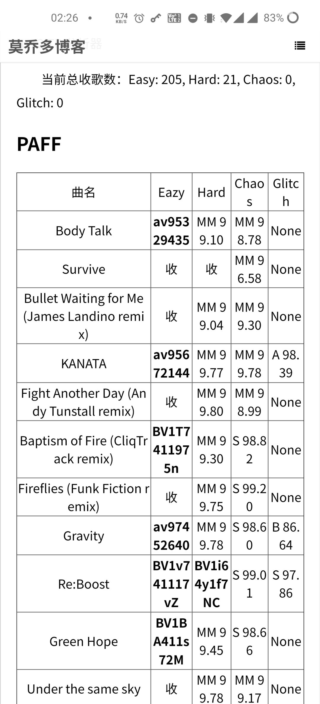 当前总收歌数:Easy: 205, Hard: 21, Chaos: 0, Glitch: 0