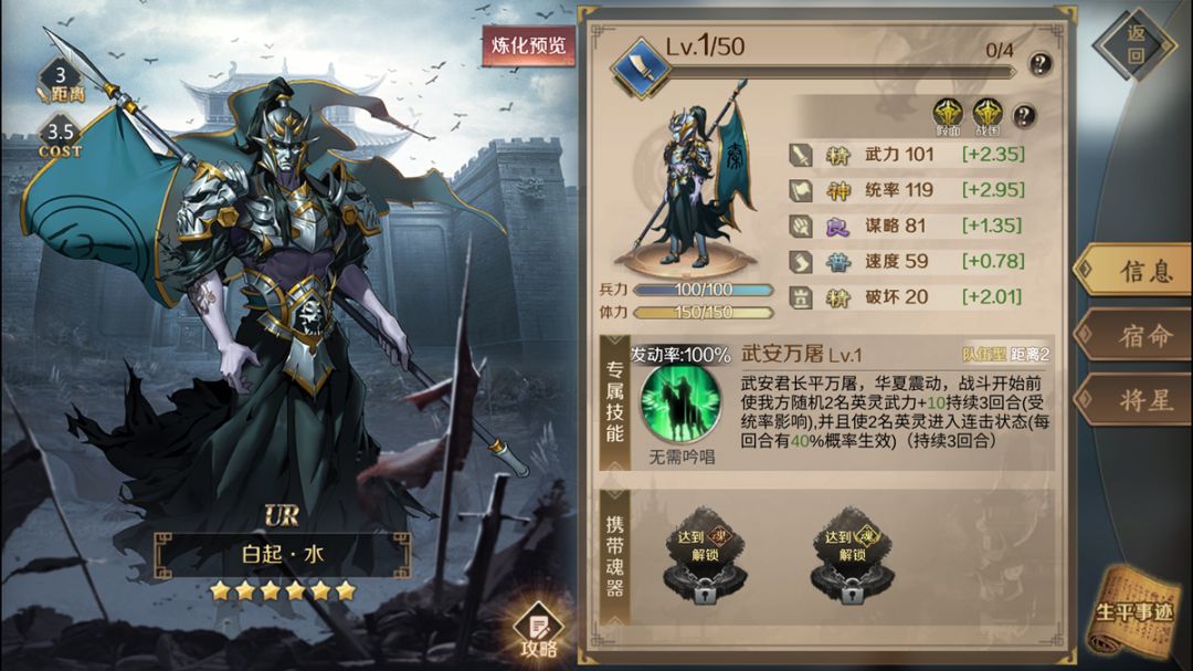 专属技能:武安万屠Lv1,武安君长平万屠,华夏震动。战斗开始前,使我方随机2名英灵物理+10持续3回合(受统率影响),并且是2名英灵进入连击状态(每回合有40%概率生效)(持续3回合)