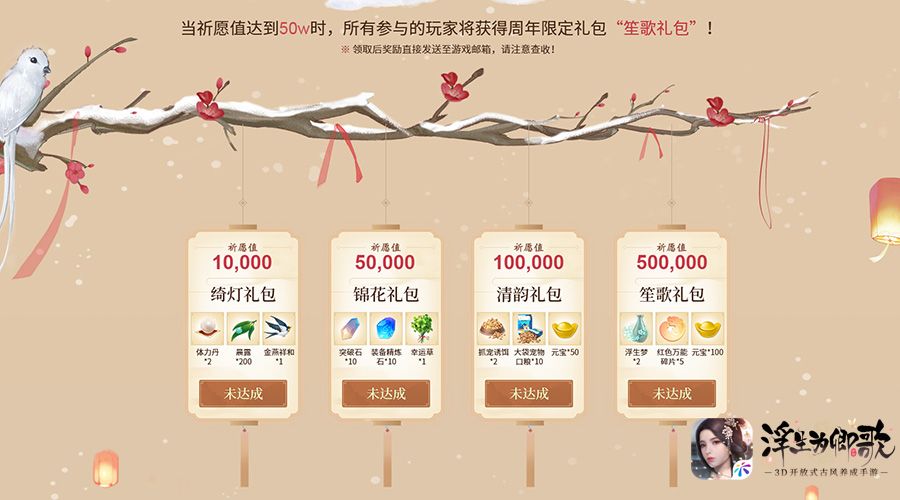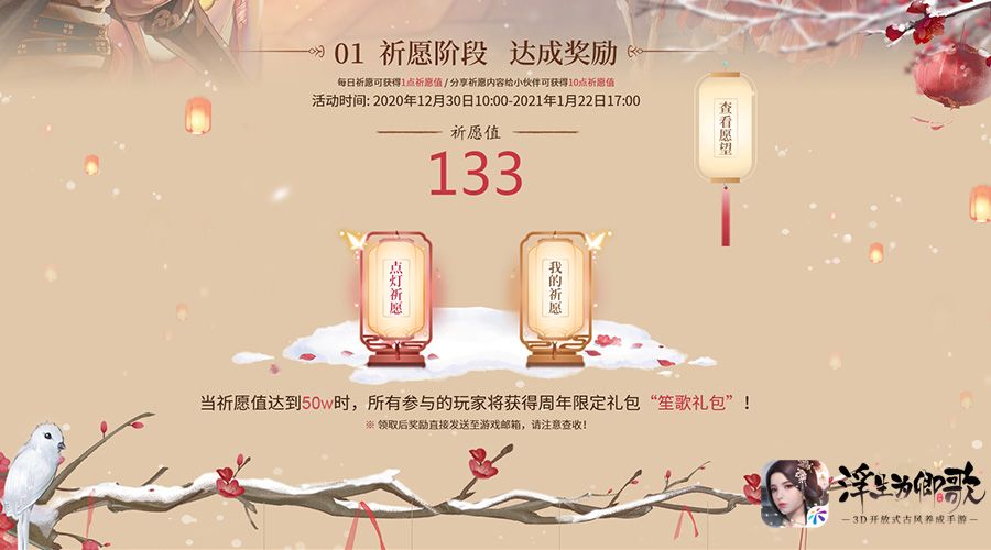 当阁下参与祈愿活动时,只要全服累计祈愿值满足一定要求,即可在活动界面领取相对应的礼包奖励,礼包内含大量珍贵道具,浮生梦、红色万能碎片、元宝、体力丹等等。不仅如此,在阁下参与祈愿时,还能在祈愿界面写下你想对《浮生为卿歌》说的一言一语,更可查看别人的愿望以及他们所分享的三两小事,唯美动人的小愿望穿插在浮世山河之中,不失为阁下古风之路的独特点缀。