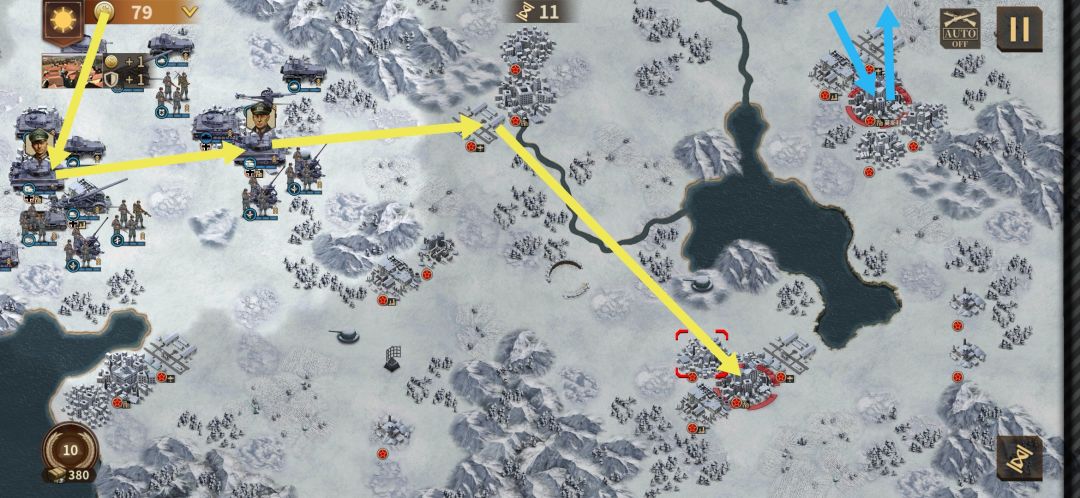 占领后主力沿蓝线迅速下移,列Ning格勒佯攻任务完成,敌方之前被吸引的部队会进行回援,且右边有敌方后备兵力,不建议硬磕。