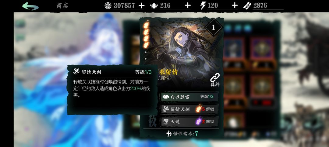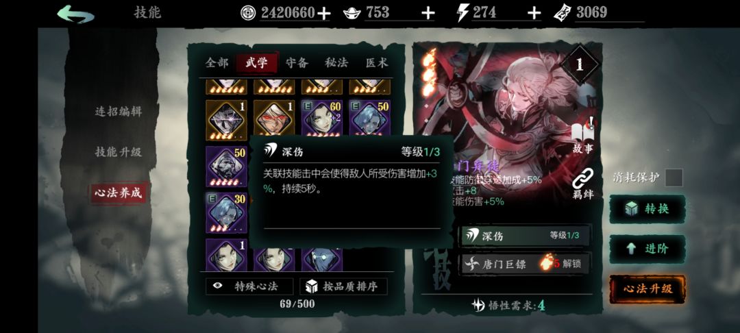 白衣留情:1绝技增加角色基础防御面板;2绝技辅助输出;3绝技概率眩晕,金色心法养成困难,不过可与黑暗无情搭配构成t1级别的黑白羁绊,前期神级羁绊