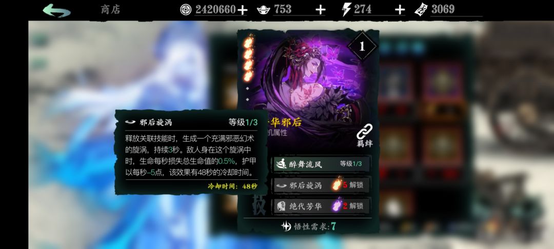 芳华邪后: 1绝技缩减关联技能冷却;2绝技辅助输出;3技能加长特殊词条boss的词条冷却时长。可与暗夜飘香构成t1级别的暗芳羁绊。