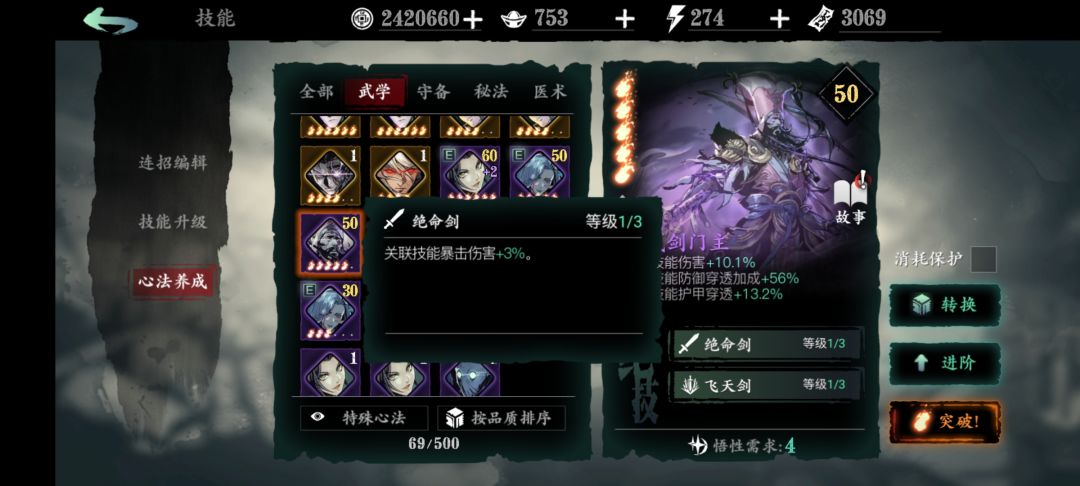 藏剑门主: 1绝技增强关联技能暴伤,2绝技辅助输出。