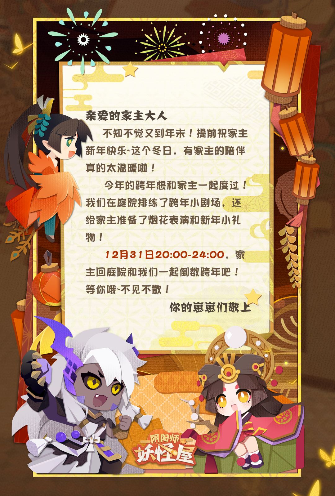 3.新年祝福剧场将于2021年1月1日0:00-1月3日23:59,家主首次进入庭院时触发,结束后将收到式神的新年贺礼哦~