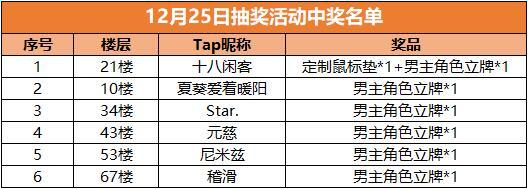 新年狂欢奖:在所有参与活动的道友中按照楼层百分比抽取10人送出男主角色立牌*1(分别为总楼层数的1%、2%、5%、10%、20%、30%、50%、70%、90%、100%向下取整)