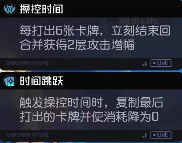 操控时间:每打出6张手牌就立马结束回合,获得2层攻击增幅。时间跳跃:每6张牌的最后一张会被复制下来,并且0费。