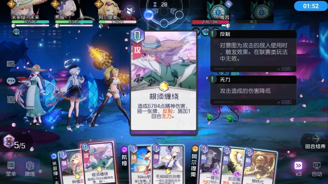 时间跳跃的特效就是可以复制回合结束的最后一张手牌(终结技也可以复制),所以这关的核心就是要算好要复制的卡牌和六张牌的次序问题。