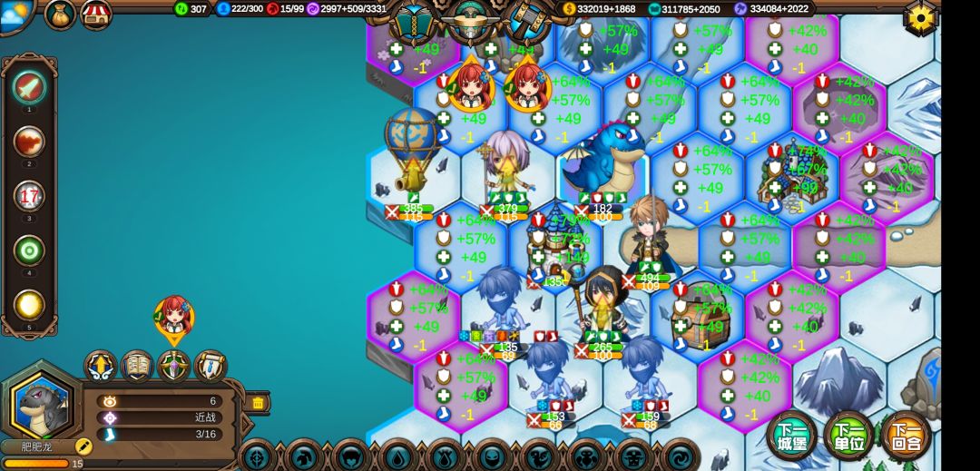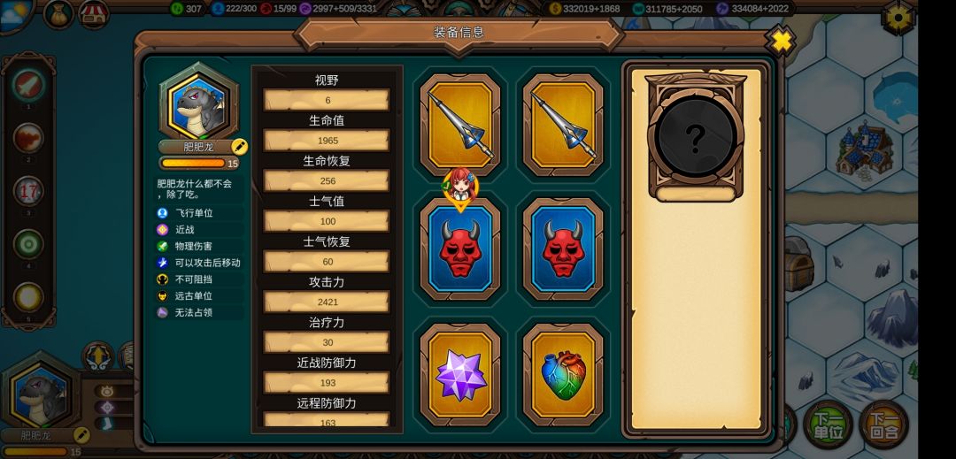 最后就是打伤害的回合了,大法师先上易伤冰冻(把装备卸了),气球上燃烧效果(带上恶魔之眼),瘟疫效果通过瘟疫之瓶在前一回合给上。肥肥龙的移动力不够多,可以用圣骑士以及指挥官的技能增加,肥肥龙跑够骑枪的技能后要到城堡位置(享受地形加成),然后大牧师上攻击祝福,指挥官上标记,人类魔法授予力量,天神魔法死亡狂热。差不多就是这样了。
