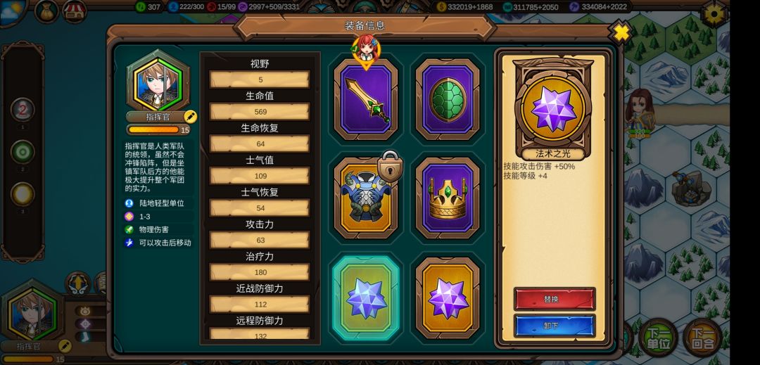 主要装备是两个法术之光,可以增加指挥官的光环技能和