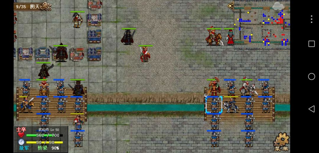7回合过后我方剩余13人与敌军出现,曹操给庞德上个强行,庞德双动快速往炮车处赶,其余人员也边打边往炮车处退。靠右些的堵一会儿桥,靠左的就撒丫子跑,注意别被敌人卡位了。
