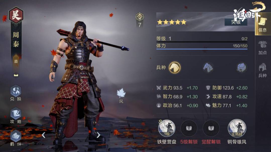 周泰的定位为盾,有着非常优秀的防御属性,武技的减伤效果非常全面且不可被驱散。考虑到驱散技能的增加和带有该效果的武将加入,在S2赛季中周泰可能会成为前排武将的最佳人选。