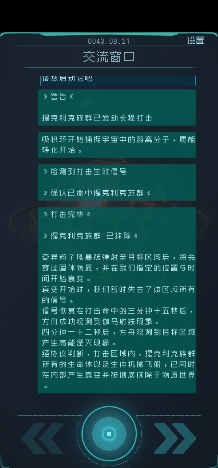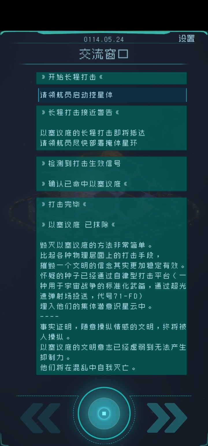 玩的过程中,感觉我自己太善良啊什么的,每次做大抉择时都觉得好困难,不愿意就这样毁灭一个文明,但又害怕蓝星的未来在自己手上遭受打击。觉得一路遇到的许多文明和我们相比来说落后太多了,我们才能如此轻而易举地去决定一个文明的命运。弱小文明的生杀予夺,全在“领航员”的一念之间。收割会使星球在星环作用下分解掉,能量为方舟所用;共生则是更人道的做法,给文明留下希望,但自己的收益更低。我比较多情感性吧,共生能保留一个文明,而收割却是没了就没了,一个文明难道只值那差值的能量吗?