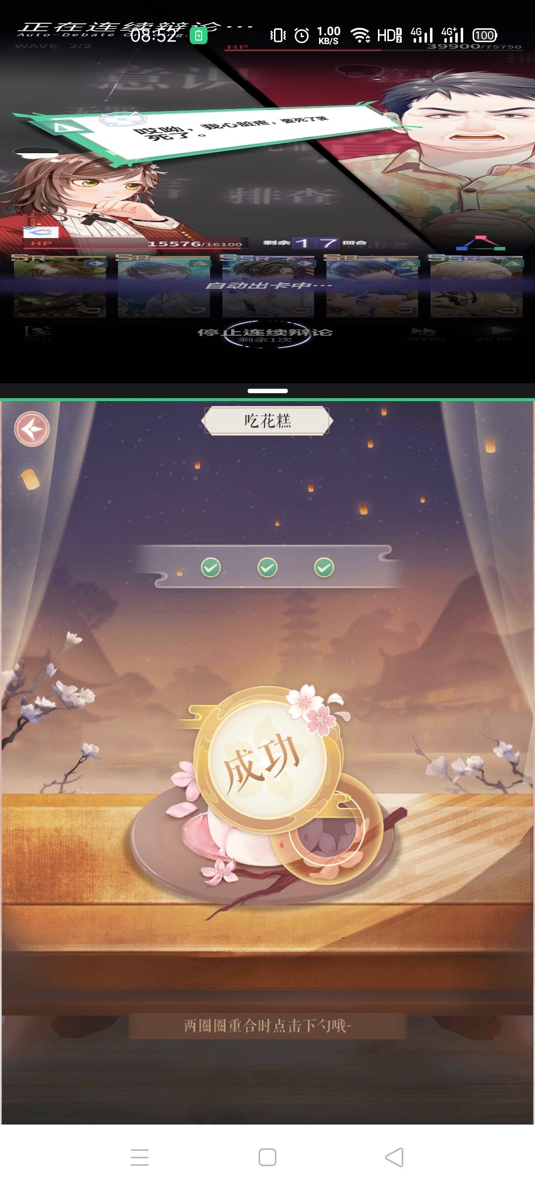 1,花糕有两个圆环,一个是较宽的固定黄圆环,还有一个是细线会大小活动的白圆环。点击的时候要等到白圆环和黄圆环重合再点,也就是白圆环大小刚好在黄圆环里面。这时候点击必定百分百成功。