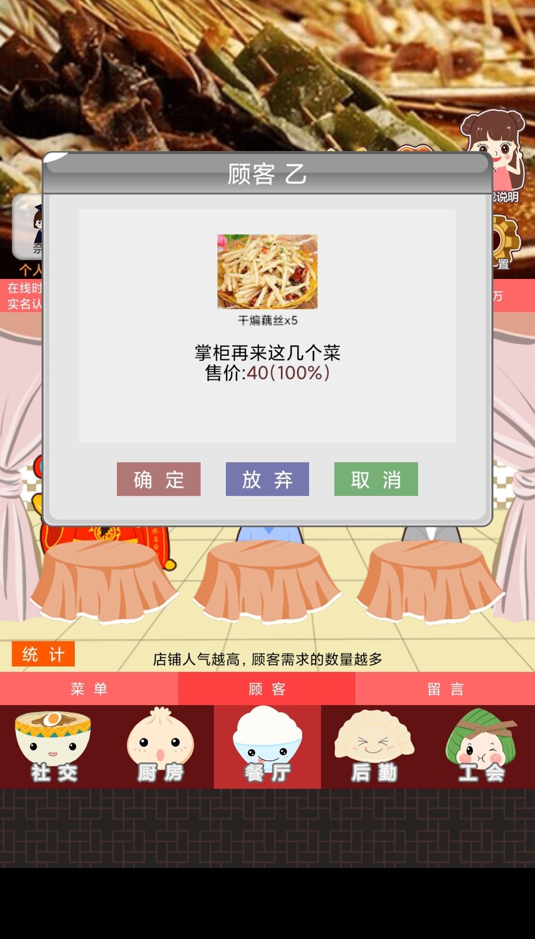 昨天刚玩这个游戏,我想问一下,为什么我店里的三位顾客总是不停问问我要同一种菜呢?昨天也是这样,今天也是这样。干煸藕丝。其他菜你不问我点,就是老是问我这一种,但是藕丝特别少。我要不要管他们呢