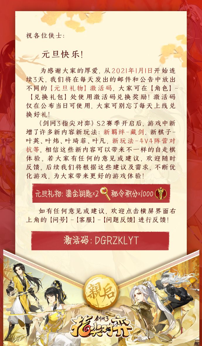 第三份【元旦礼物】激活码已发放至大家的游戏邮箱,大家可以登录《剑网3指尖对弈》兑换领取。