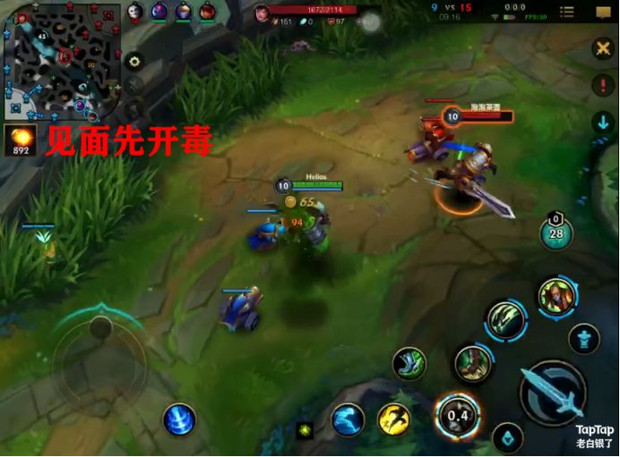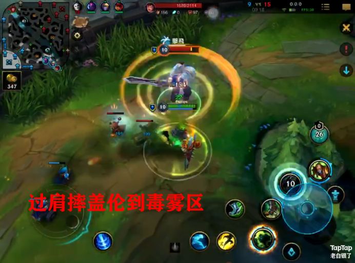 看到我们开毒之后,盖伦以为我们还是之前那个好欺负的炼金,于是上前开启3技能绕着我们转圈圈。老白果断使用3技能把他丢到身后的毒雾区,顺便规避旋转的伤害。