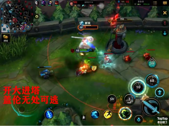 由于之前缠斗的区域离对面塔下较近,盖伦连滚带爬还是顺利回到了塔下。但老白并不打算放过他,果断开大利用高额的双抗和移速硬抗防御塔的伤害,进塔继续毒害盖伦。