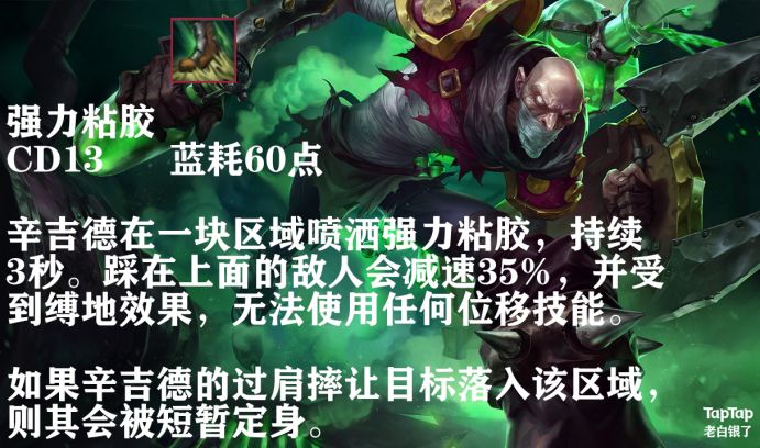 辛吉德的2技能是一个较软的控制技能,但和3技能配合可以打出不错的控制效果。喷洒强力粘胶后会让站在上面的敌人减速并受到缚地效果。缚地是英雄联盟一个比较少见的控制效果,被缚地的敌人是无法使用位移技能的。
