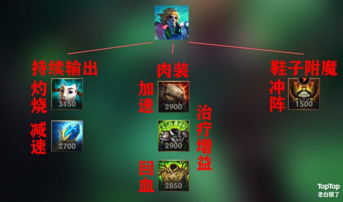 装备方面前两件老白推荐大家出面具和冰杖两件套,这两件装备不仅能给敌人造成持续的灼烧伤害,还可以减速敌人,两者之间的联动性非常好的同时也格外适配辛吉德的1技能。有了这两件输出装之后辛吉德就能打出很高的持续伤害了,剩下三件装备可以全部肉,老白推荐的是亡板、绿甲和狂徒,亡板提供护甲的加速效果,绿甲提供魔抗和治疗增益,最后一件狂徒则能够让炼金在脱战后快速回血,增加炼金的续航能力。鞋子二级推荐大家选择三速鞋或者根据对面的伤害类型和控制强度选择布甲鞋或魔抗鞋,附魔选择正义荣耀,提高炼金的冲阵能力,开启之后更高,更快,更远!